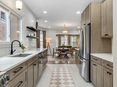 Completely renovated kitchen features painted maple shaker cabinets, stainless steel appliances, quartz countertops, designer tile backsplash with a definite mid century vibe.